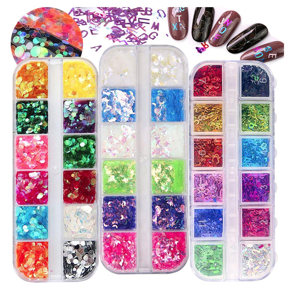 OU WILL GET—1 pack mermaid holo disc nail glitter sequins, 1 pack iridescent moon shape nail glitter, 1 pack laser letter of the alphabet nail glitter flakes and 3 sheet water transfer nail decals